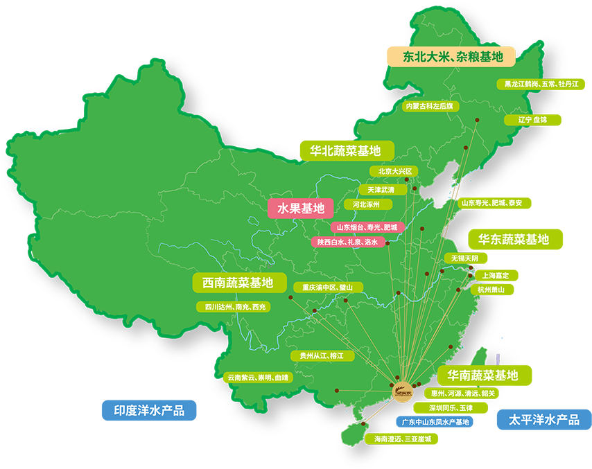 在广东、云南、贵州、四川、湖北、海南.内蒙、山东等地建立近20万亩符合无公害种植标准的种植基地从源头保障了肉菜和蔬菜的供应,并与当地农业局紧密合作,并聘请专家指导种植。